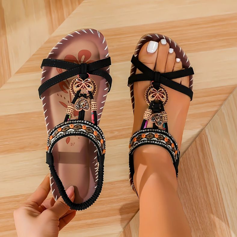Deze handgemaakte sandalen combineren een zacht, dempend voetbed met een vrouwelijk design vol bloemrijke details en siersteentjes. De elastische banden passen zich moeiteloos aan je voeten aan, zonder knellen of snijden. Ideaal voor lange wandelingen, zomerse dagen of gewoon om je outfit een verfijnde touch te geven.
