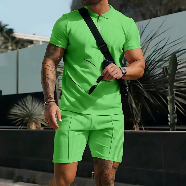 Onze iconische zomer-set bestaat uit een ritspolo en bijpassende shorts, vervaardigd van hoogwaardig dubbelzijdig Peruaans katoen met een wafelstructuur aan de buitenkant en ultrasoft jerseyvoering aan de binnenzijde. De stof is licht, soepel en antimicrobieel behandeld – zodat jij de dag doorkomt zonder geur of beperking.